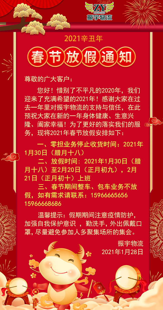 您好!惜別了不平凡的2020年,我們迎來了充滿希望的2021年!感謝大家在過去一年里對振宇物流的支持與信任,在此預祝大家在新的一年身體健康、生意興隆、闔家幸福!為了更好的落實我們的服務,現(xiàn)將2021年春節(jié)放假安排如下: