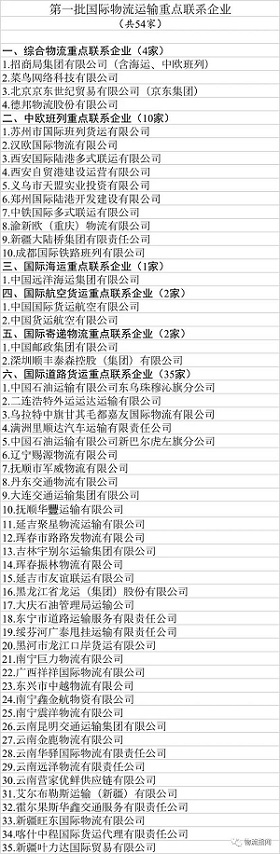 按照運力資源充足、網(wǎng)絡(luò)覆蓋健全、運輸組織高效、經(jīng)營信譽良好的原則,經(jīng)各有關(guān)部門及沿邊省份交通運輸主管部門推薦,確定54家企業(yè)作為第一批國際物流運輸重點聯(lián)系企業(yè),其中,綜合物流企業(yè)4家、中歐班列運營企業(yè)10家、國際航運企業(yè)1家、國際航空貨運企業(yè)2家、國際寄遞物流企業(yè)2家、國際道路運輸企業(yè)35家。包括招商局集團、菜鳥網(wǎng)絡(luò)、京東集團、德邦股份、中遠海運、中國郵政集團、順豐、國貨航等企業(yè)入圍。