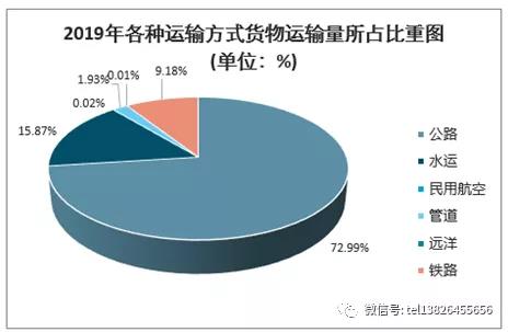 從貨物運輸?shù)姆绞嚼矗愤\輸仍然占據(jù)著我國貨物運輸行業(yè)的主導地位。2019年各種貨運運輸量中公路運輸量占比最大,達到了72.99%;其次為水運,占比為15.87%;鐵路運輸量占比9.18%,位居第三。我國民航運輸業(yè)起步較晚,仍處于發(fā)展階段,貨機數(shù)量整體來說相對較少,這導致2019年民航貨運量占比僅有0.02%。