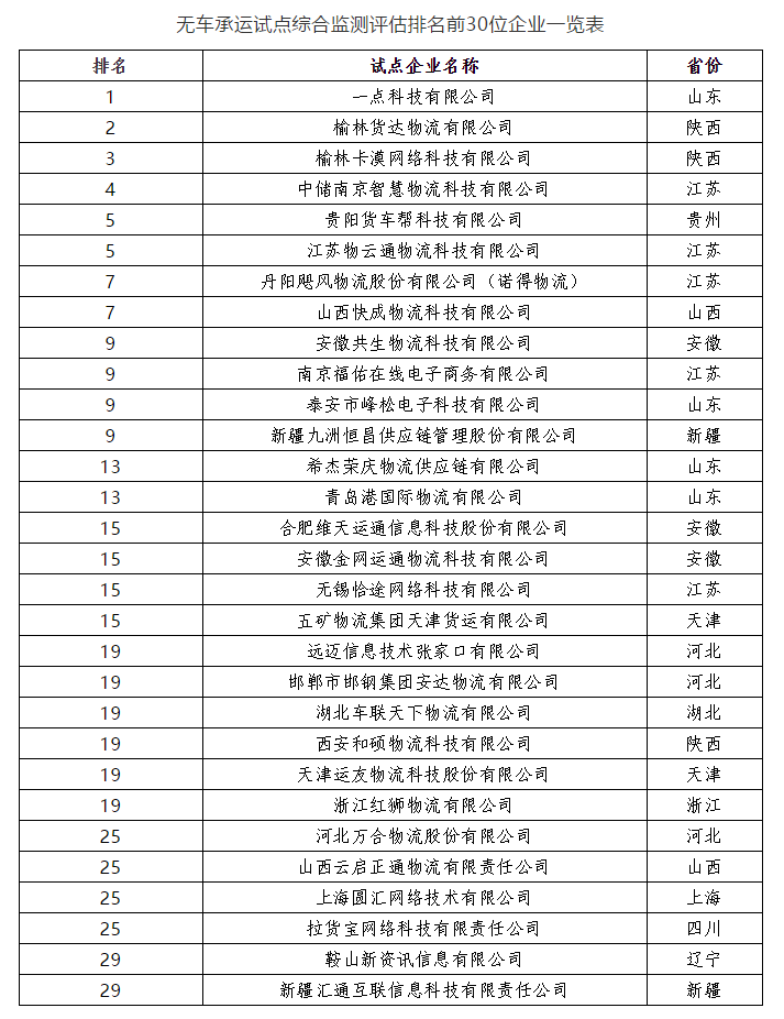 無車試點排名前30的,50%以上都是跟大宗運輸相關(guān)