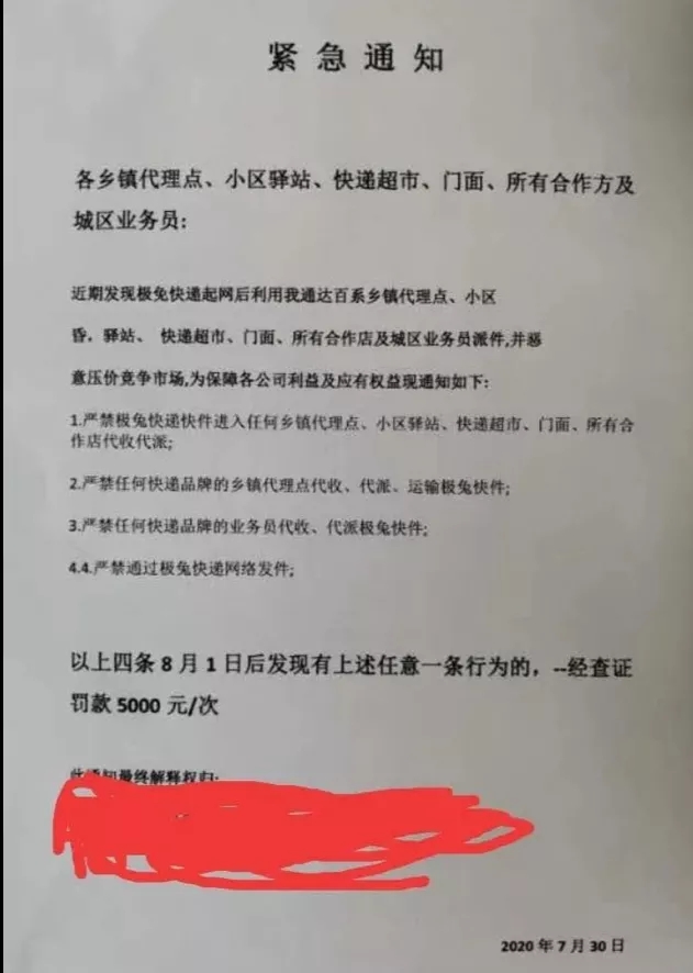 7月底,有某通達(dá)系快遞總部下發(fā)通知,要求全網(wǎng)各網(wǎng)點(diǎn)禁止代理極兔速遞業(yè)務(wù),通知指出,攬派兩端加盟公司不得以任何理由、任何形式代理極兔速遞業(yè)務(wù)。還有通知指出,如果通達(dá)百系中鄉(xiāng)鎮(zhèn)代理點(diǎn)、小區(qū)、驛站、快遞超市等業(yè)務(wù)員因惡性低價(jià)競爭攬收極兔速遞的,經(jīng)查證,每次予以5000元罰款。
