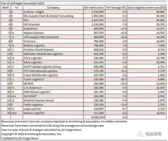 7月11日消息,第三方物流咨詢機(jī)構(gòu)Armstrong&Associates.Inc發(fā)布了最新的2022年航空貨代TOP25排名。前25家空運(yùn)貨代公司的總貨量同比下降了6.3%,達(dá)到1690萬(wàn)噸。其中,前五名延續(xù)去年的排名,分別為德迅(K+N)、DHL、DSV、DB Schenker、Expeditors。德迅憑借223萬(wàn)噸的空運(yùn)貨量,進(jìn)一步擴(kuò)大了對(duì)DHL的領(lǐng)先優(yōu)勢(shì),再次成為全球最大航空貨運(yùn)代理公司。排名第二的DHL去年空運(yùn)貨物量下降了9.3%,達(dá)到190萬(wàn)噸,反映出了整體空運(yùn)貨代市場(chǎng)的情況。