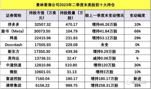 根據(jù)13F文件,截至6月30日,景林資產(chǎn)在美股持有28只證券,合計(jì)持倉市值達(dá)到20.69億美元(約合人民幣149.76億元),環(huán)比增幅約20%。具體來看,二季度末其美股前十大重倉股分別是拼多多、臉書母公司Meta、網(wǎng)易、Doordash、新東方、英偉達(dá)、中通快遞、微軟、富途控股、滿幫集團(tuán),中概股依舊占主導(dǎo)。